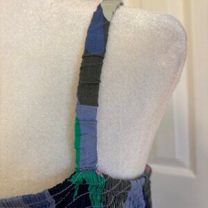 Stunning summer dress with a bright multicolor floral pattern and an asymmetrical handkerchief hem. Square neckline, smocked bodice and stretchy shoulder straps. Side pockets as well. Pit to pit measurement is 19 inches, but there's lots of stretch. Made of 100% cotton, the elastic is 69% polyester/31% spandex. Machine washable.