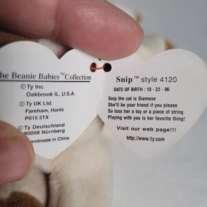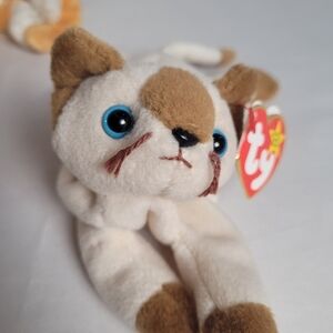 Lot of 2 Ty Beanie Babies Cat Plush. Included is 1996 Siamese Snips and 2001 Orange Tabby Tabs. The orange cats tag does have damage but both cats are in great condition. Measures 7".