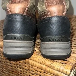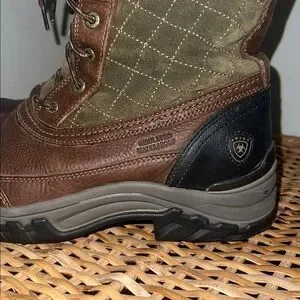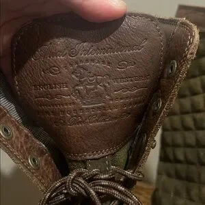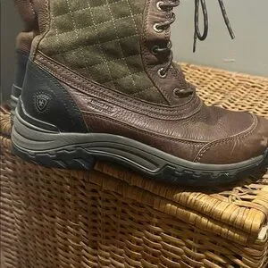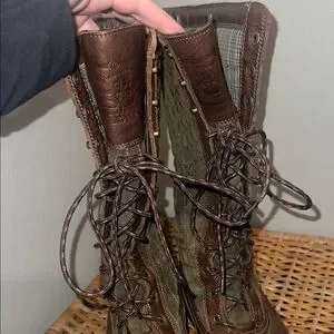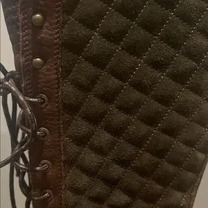 Stylish knee-high boots with a quilted design. Features brown leather and green fabric. Perfect for outdoor adventures. Equestrian riding. Worn a couple times. Like new!!So warm!!