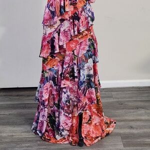 Vibrant floral design with asymmetrical ruffles. Halter neck style. Perfect for elegant occasions.
