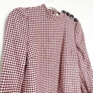 Style Notes: mini length, long sleeve, fully lined, button detail on shoulder, burgundy and white micro houndstooth print, high neck