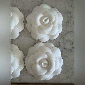 10 white Chanel camellias. Most are from France rue Cambon store. Pristine except for adhesive backing has been used so you have to use your own adhesive to attach. Perfect for adding elegance. Cannot be bought individually. Only given out with purchases. Make an offer.