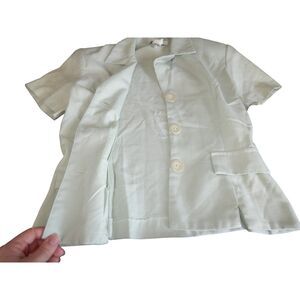 * shirt is short sleeve, button front (3 functional large tan colored buttons), v-neck/v-neckline, 2 faux pocket flaps on the front sides, has attached shoulder pads, solid seafoam green/light pastel green color. 65% polyester & 35% rayon (dry clean only per tag). Made in Sri Lanka. slight discoloration/staining on the front/sides/back of sleeves-hardly noticeable but present nonetheless.