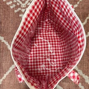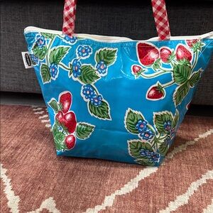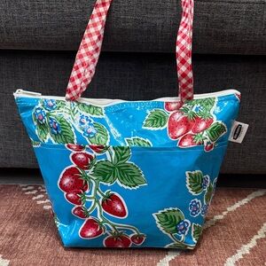 Super cute Freckled Sage tote made from genuine oilcloth fabric — a traditional cotton fabric coated for durability and water resistance. Features a vibrant blue strawberry and floral print with red gingham handles and a coordinating gingham oilcloth interior.
