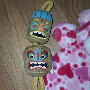 These are super fun dog toys. The Valentines Wrinkleez bear has crinkles in the body & a squeaky head. The Tiki Twins have tug of war ropes & both heads squeak. These toys are new & have never been played with. They are structured for a medium to small dog.