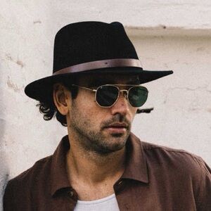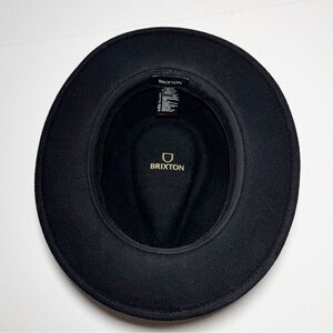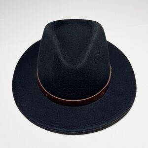 Brixton Messer Fedora, black 100% wool with brown faux leather band. A classic fedora, straight brim, teardrop crown. Excellent used condition, only worn a few times. Unisex, size large, 7 1/2, 60cm, brim 2.5”. Stock photos included to help show style/fit.