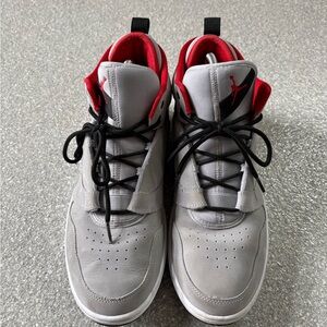 Elevate your look with these Jordan sneakers. Gray body with bold red highlights. Ideal for casual wear.