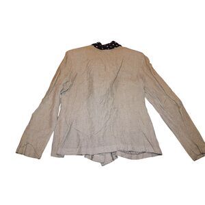 * shirt is long sleeve, pullover/button front (4 front buttons are functional), has attached inner faux-layered neckline with draping scarf ties, attached shoulder pads, 2 front/side faux-pocket flaps. Fabric of shirt has some discoloration/stained areas present (tops of shoulders/back of shoulders) see photos. Shirt also has many loose threads on the buttonholes in the front.