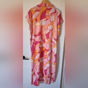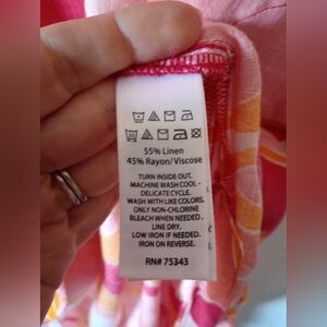 Stylish linen blend maxi dress with a vibrant pink and orange pattern. Features side slits, a v-neck, pockets, and a light airy fit. Perfect for the beach, cruise, vacations, etc. It is in very good gently used condition from a non-smoking home.