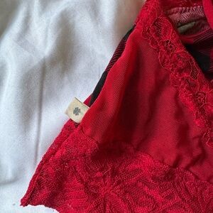 This stylish red and black lace bralette offers comfort and elegance. Perfect for everyday wear or a special occasion.