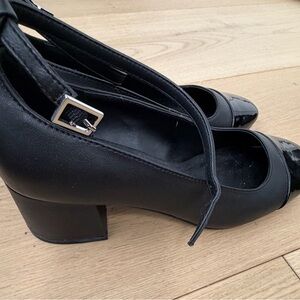 Chic black pumps with a block heel. Sleek design for versatile wear.