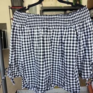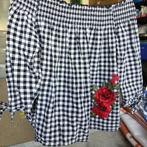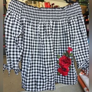 Gypsies & Moindust Gingham Off The Shoulder Floral Applique XL Black White