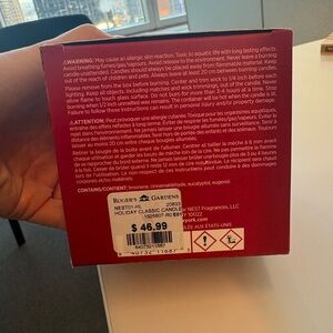 Festive NEST Fragrances candle. Rich holiday scent. Elegant red and gold design.