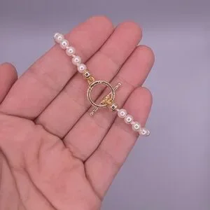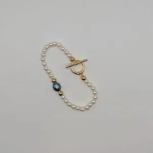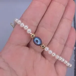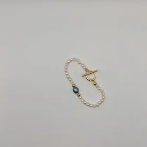 This handmade bracelet features white glass pearls and a vintage freshwater pearl professionally strung on a silk cord and a gold plated clasp. I am a hobby jeweler and I am selling it because I have too many bracelets.