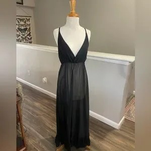 Vintage Sheer Black Maxi Nightgown Deep V Spaghetti Strap Long Chemise L
