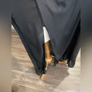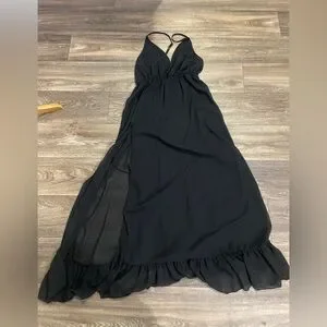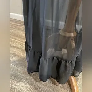 Ethereal vintage sheer black maxi nightgown with a romantic, flowing silhouette. This piece features a deep V-neckline, delicate spaghetti straps, and an empire waist that drapes effortlessly into a floor-length sheer skirt. Finished with a subtle ruffled hem for soft movement.