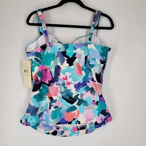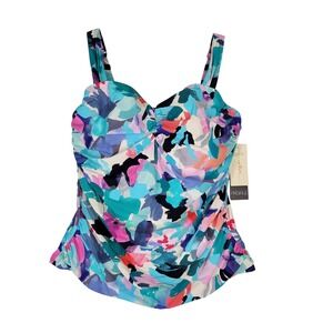 Profile by Gottex abstract floral print swim top tankini. Features a sweetheart neckline with gathering at the bust for a flattering effect, adjustable shoulder straps, and ruching at the sides to create a slimming silhouette. Built-in underwired bra cups offer support and shaping. This tankini top is designed with tummy control features to provide a smooth and flattering look. The vibrant abstract floral print in shades of blue, teal, pink, purple, and coral adds a pop of color to your swimwear collection. Retail $134.00.