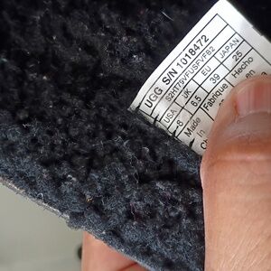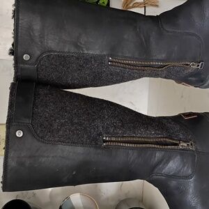 Stylish UGG boots with a cozy interior. Black leather with gray fabric panels. Ideal for cold weather.