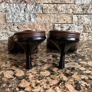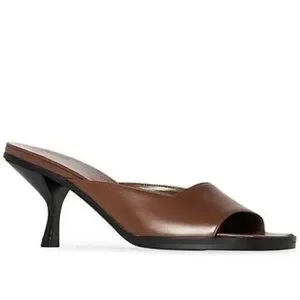 contemporary silhouette with square open toes and wide, angular straps. They rest atop concave heels and come in smooth, brown leather.
