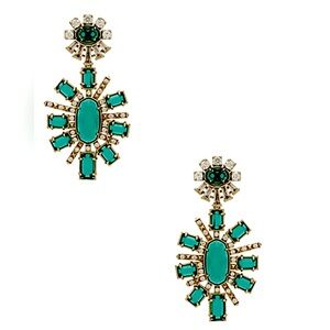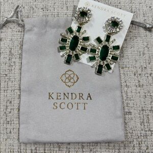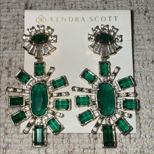 Dazzling earrings with emerald green stones, clear CZ crystals and gold accents. Post backs. Perfect for an elegant look with these Kendra Scott statement earrings. Lovingly cared for from a pet and smoke free home. Jewelry pouch included. Note: The last pic is for size/scale only. 2.7” long