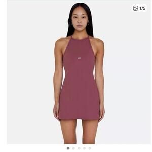 SET Active Sportbody™ athletic dress in a mauve pink tone, designed with a sleek racerback neckline and flowy A-line skirt. Features built-in fitted shorts underneath for coverage and comfort with top slit for easy pull down, making it ideal for tennis, workouts, athleisure, or casual everyday wear. Crafted from a stretchy, performance fabric blend that moves with you while maintaining structure.
