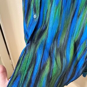 Abstract textured button-up blouse featuring a blue, green, and black color palette.