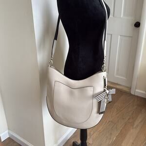 HENRI BENDEL Cream W57TH Large Hobo Stripes With Guitar Strap Crossbody with hanging “HB” charm.