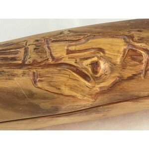 Presumably handcrafted & live edged, this wood box is a log shape with hinged lid. Presumably carved, this has natural grain patterns, knots, and textures, including a distinctive hand-carved design on the exterior.