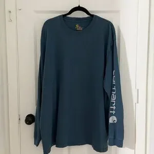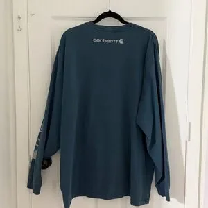 Men Carhartt Original Fit Long Sleeve Logo Shirt Size: 2XL Color: Slate Blue Approximate lay flat measurement: Pit to pit: 28 inch Full length: 32 inch Fabric: 100% cotton Condition: VGUC Slightly cracking on the logo shown in the last photo in the listing No stains/ holes/ defects Disclaimer: color may differ due to lighting