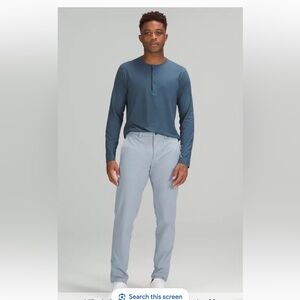 This is a pair of Lululemon Commission Slim-fit Pants 32" in a light grey color. They are inspired by chinos and feature ABC (Anti-Ball-Crushing) technology for comfort and an ergonomic gusset to remove tension. The fabric is lightweight and stretchy, designed for all-day comfort.