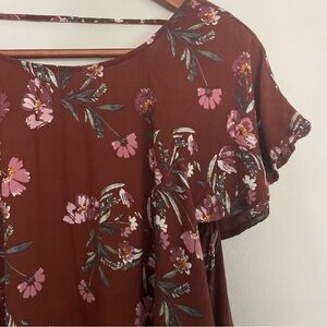 Chloe & Katie Brown Floral Flutter Sleeve Blouse Spring Summer Top Soft Rayon, M