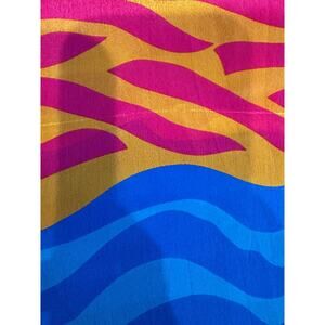 Vintage 80s Liz Claiborne Bold Print Rectangular Neck Scarf Turquoise Blue. Good preowned condition with a small couple of spots where pink ran into the yellow - see pic as well as one either pull or mistake in stitching - see pic.