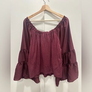 Chic burgundy blouse with ruffle sleeves. Off-shoulder design. Perfect for versatile styling.