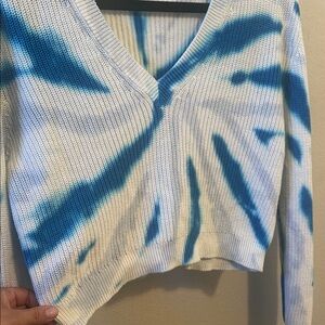 Chic sweater with blue and white design. Features a stylish V-neck.