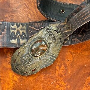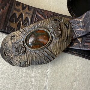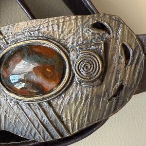 The buckle is brass with center stone that I believe is a fire agate. The buckle is signed on the back.