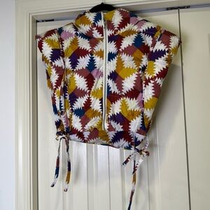 Keywords: isabel marant, hoodia vest, cropped puffer vest, multicolor vest, colorful pattern, quilted vest, geometric print, designer vest, luxury outerwear, statement vest, boho chic, fall fashion, winter vest, reversible look, bright print puffer, high fashion vest, editorial style, trendy vest, rare designer piece, outerwear, insulated vest, colorful puffer, womens vest, french designer, avant garde style, puff jacket
