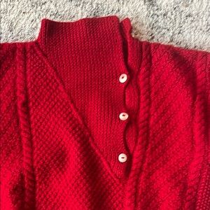 This incredible hand knitted in Uruguay red sweater is a ladies size medium. This sweater will keep you the warmest. I have worn it a few times, but I am ready to pass it along. Laying flat, pit to pit is 21 inches. Please see additional Photos for more measurements. Asymmetrical button down cow neck style. Five total natural buttons. No unusual wear, no snags or holes, or tears. Excellent preowned condition for a gorgeous piece from South America. Stay warm and stylish with this elegant red turtleneck sweater. Perfect for any occasion, it features a classic design with button accents. A true vintage gem.