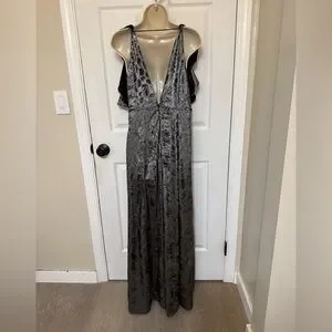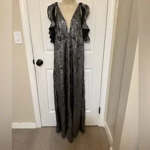 Make an entrance this season in this Topshop silver metallic maxi dress, designed for drama and elegance. Features a deep V neckline, ruffled cold-shoulder sleeves, and a shimmery textured finish that catches the light beautifully. The full-length skirt flows with every step—ideal for holiday parties, New Year’s Eve, or any special occasion.