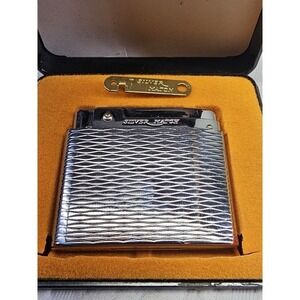 A vintage Silver Match lighter with a chrome finish and distinctive engraved diamond pattern. This lighter comes in its original case, featuring a plush orange interior and the Silver Match logo on the lid. The included metal tool is designed for flint replacement. Perfect for collectors or as a sophisticated accessory for special occasions.