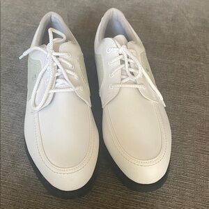Stylish FootJoy golf shoes. White upper with cream accents. Durable black sole. Perfect for sports and casual wear. Golf shoes!