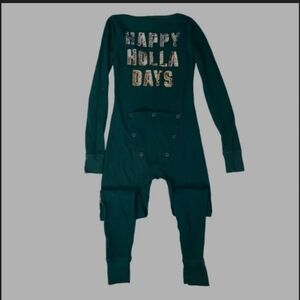 Festive green & sequin onesie with 'Happy Holla Days' in gold. Perfect for the holidays! Butt buttons.