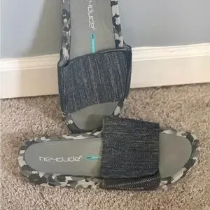 Comfortable slides with a black and gray camo design. Perfect for casual wear.