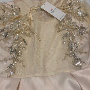 Step into elegance with this stunning cream prom dress, featuring exquisite floral embellishments. Perfect for making a statement at any special occasion.