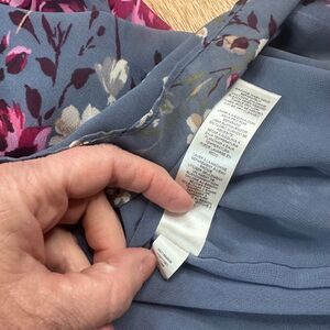 White House Black Market sheer floral blouse in a soft dusty blue with pink and ivory floral print. Designed with a flattering V-neckline trimmed in delicate white lace and hidden hook-and-eye closures for adjustable coverage.