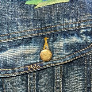Classic blue denim jacket with cozy sherpa collar. Features colorful embroidered designs and flag patch. Ideal for stylish warmth.