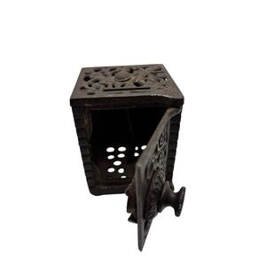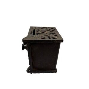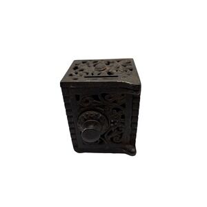 Keywords: antique bank, cast iron safe, vintage coin bank, still bank, filigree metal box, combination safe bank, rustic decor bank, industrial antique, victorian style bank, collectible bank, metal piggy bank, heavy iron bank