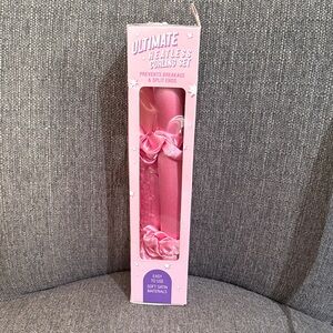 Ultimate heatless curling set in pink. Easy to use with no heat damage. 1 Satin curling rod, 2 satin scrunchies, 1 claw hair clip.