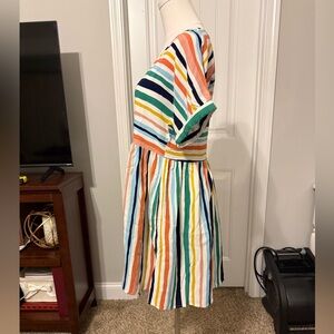 Super cute v-neck dress with multicolor stripes. Soft rayon fabric with 2 side pockets. Dress is unlined. Very good used condition. Measurements in photos.