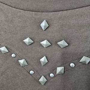 Brand new with tags attached, this hard-to-find French Terry Sweatshirt is the epitome of western southwestern coastal cowgirl casual style. Front round circle metal metallic circular and diamond pyramid stud studs accents at front with scalloped yoke style design and complementary stitching. Relaxed fit with dolman batwing bat wing full sleeve. Wide, almost boatneck boat Bateau neck neckline. Round RL LRL hammered embossed logo monogram signature at front bottom. Popover pullover style. 22" dolman pit to dolman pit and 24" long, measurements are approximate. Earthy earthtone Western core Westerncore vintage Americana long sleeve sleeves sleeved.
