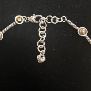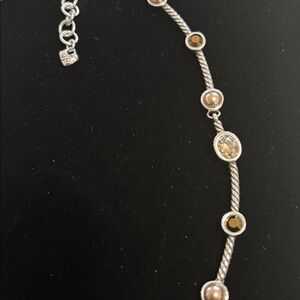 amber/gold-ish color crystals. Sits just at neckline for blouses/ tees/sweaters. Very pretty!